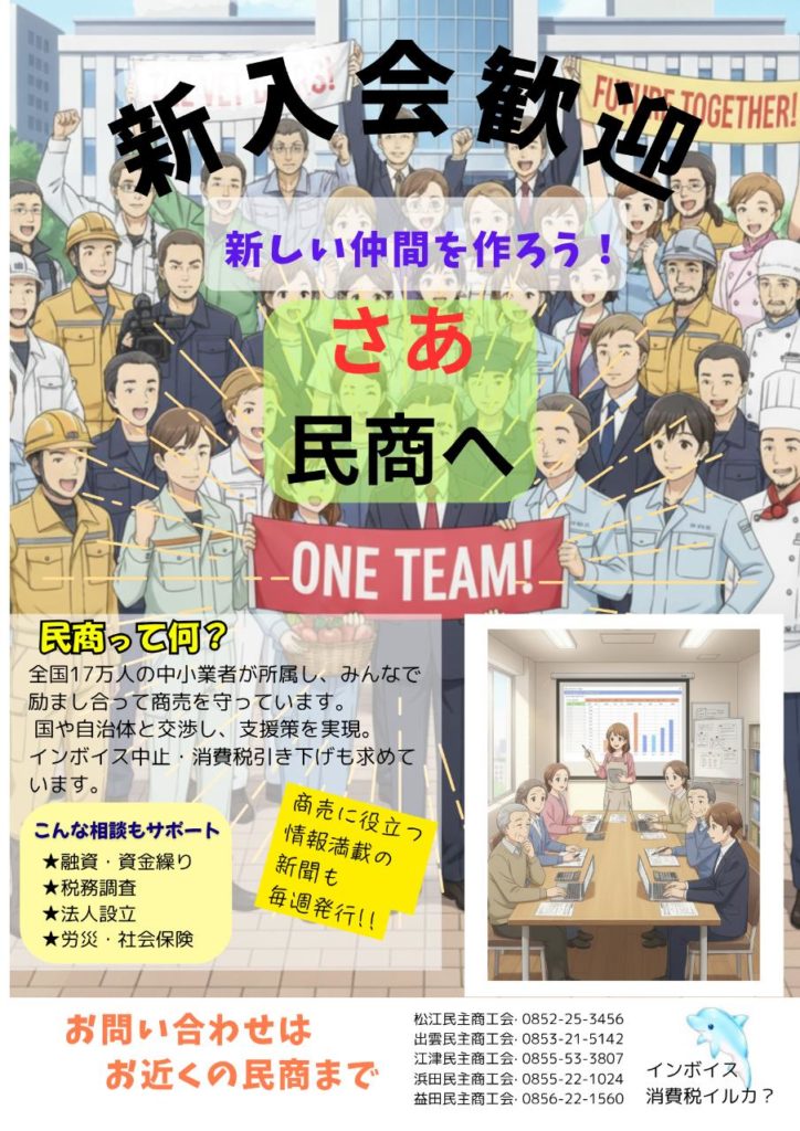 島根県内の「民商チラシ」が完成 ニュース 2026.01.12 島根県内の「#民商チラシ」が完成しました 1月15日(木)、新聞折込されます 対象エリア #松江民商 ・ #出雲民商・ #江津民商 ・ #浜田民商・ #益田民商 「民商ってどんなところ?」 そう思った方にこそ、ぜひ読んでほしい内容です 地域の商売人の「リアルな声」が満載 1人で悩んでいませんか? これって自分のことかも? 自分の未来、地域の未来。 1人で抱え込まず、一緒に解決しましょう お近くの民商へ、お気軽にご相談ください! 拡散&保存大歓迎!リポストお願いします。 #島根 #確定申告 #インボイス #商売人の味方 #中小企業支援 #フリーランス #個人事業主 #まちの相談所 #松江 #出雲 #江津 #浜田 #益田